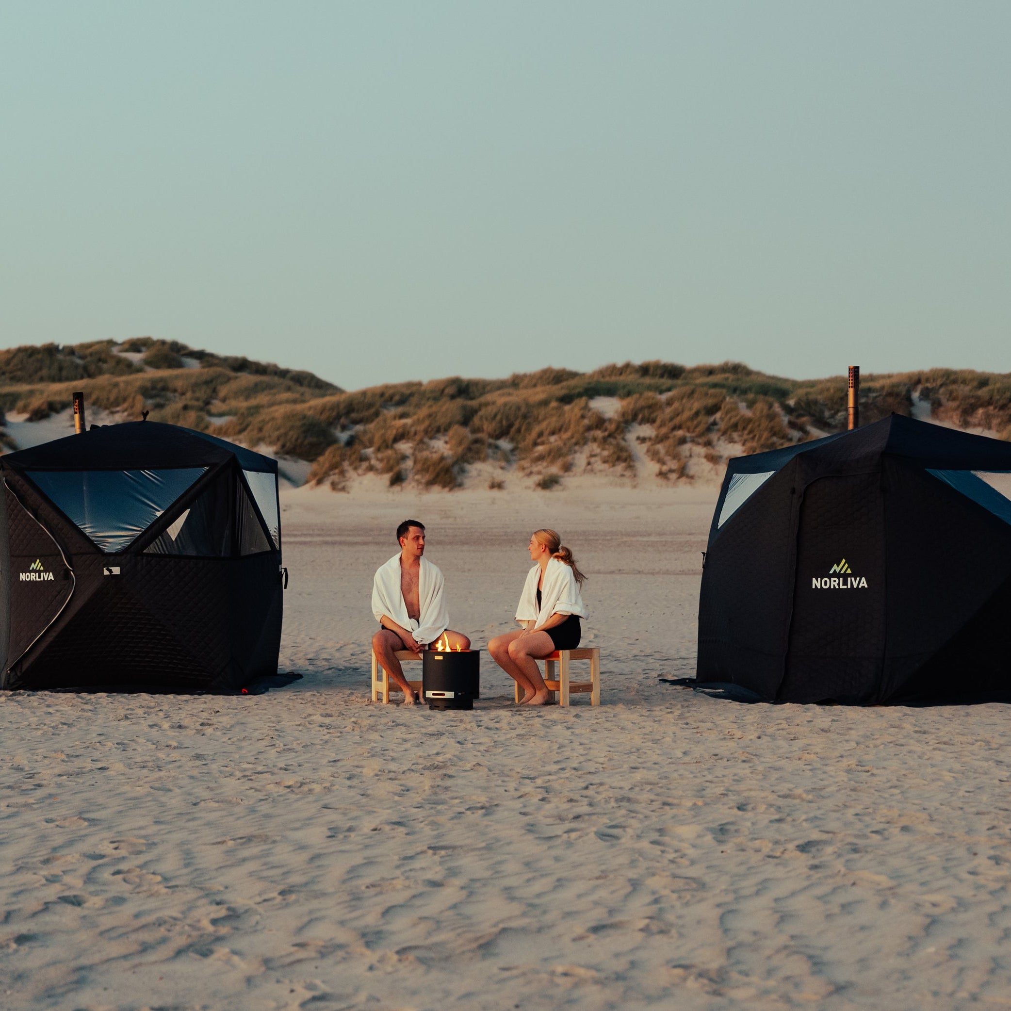 Das Saunazelt darf nur im Freien und mit ausreichend Abstand zu Gebäuden, Bäumen und brennbaren Materialien betrieben werden..