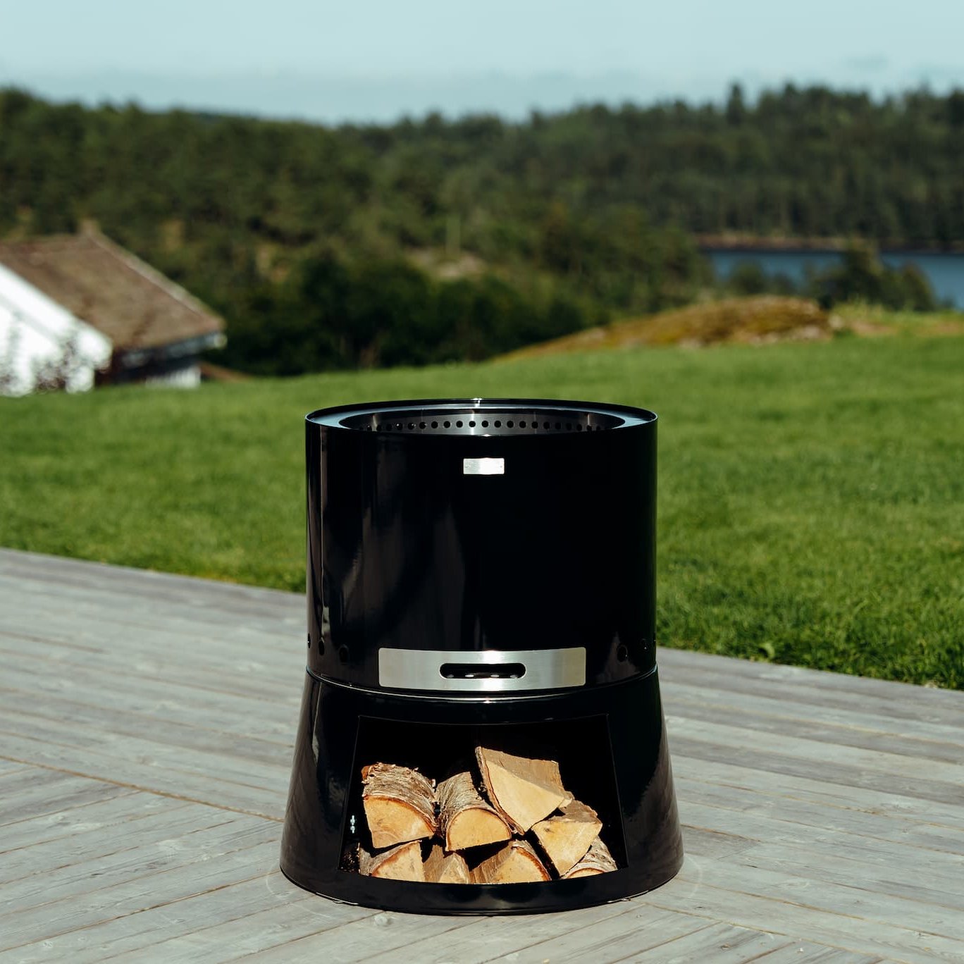 Le compartiment intégré offre de la place pour le bois, élève le foyer à une hauteur d'assise confortable et protège le sol des traces de brûlure.