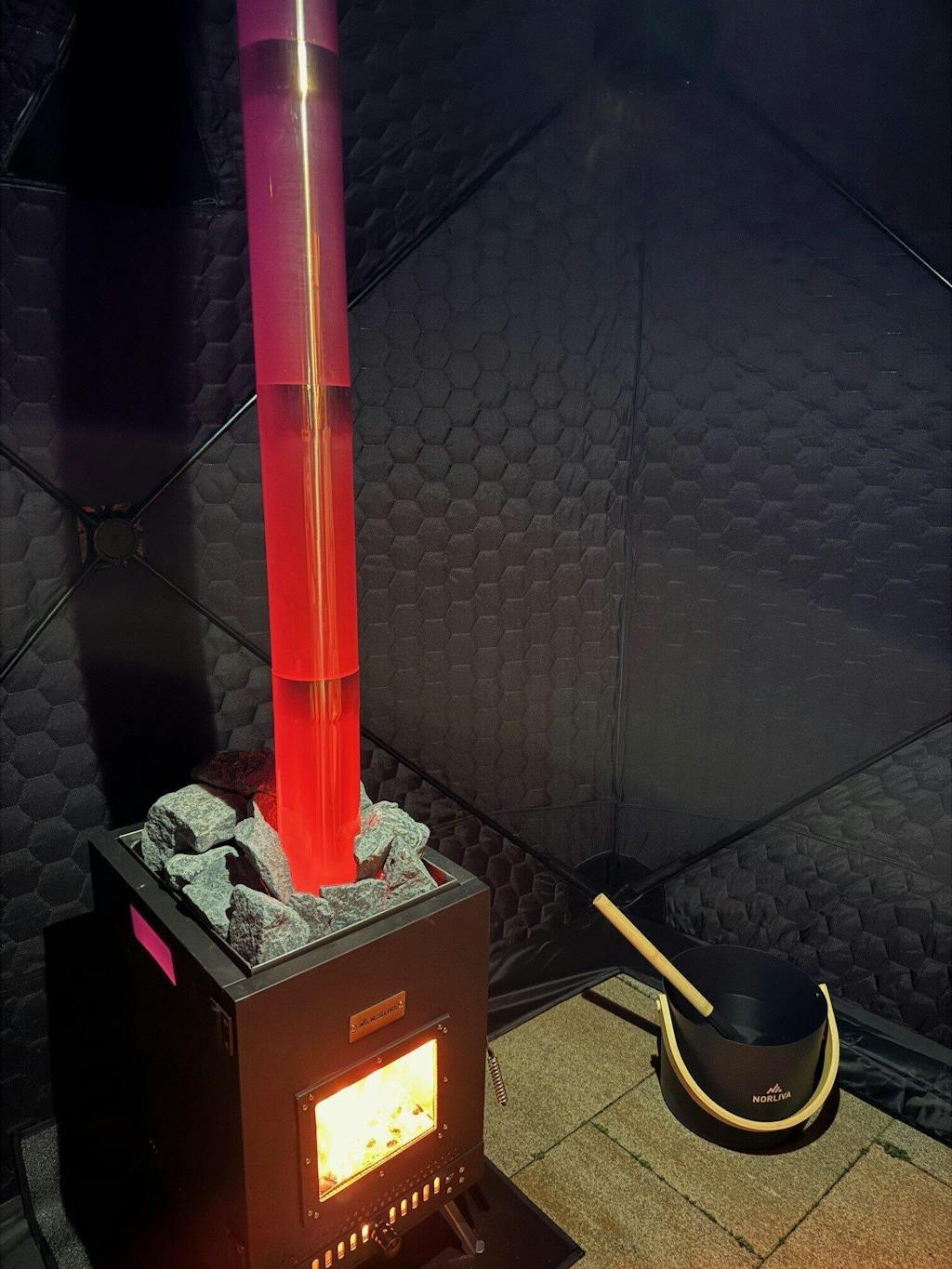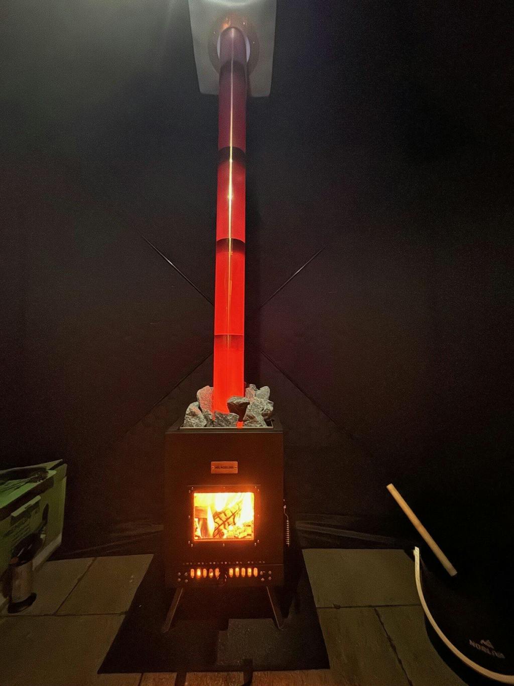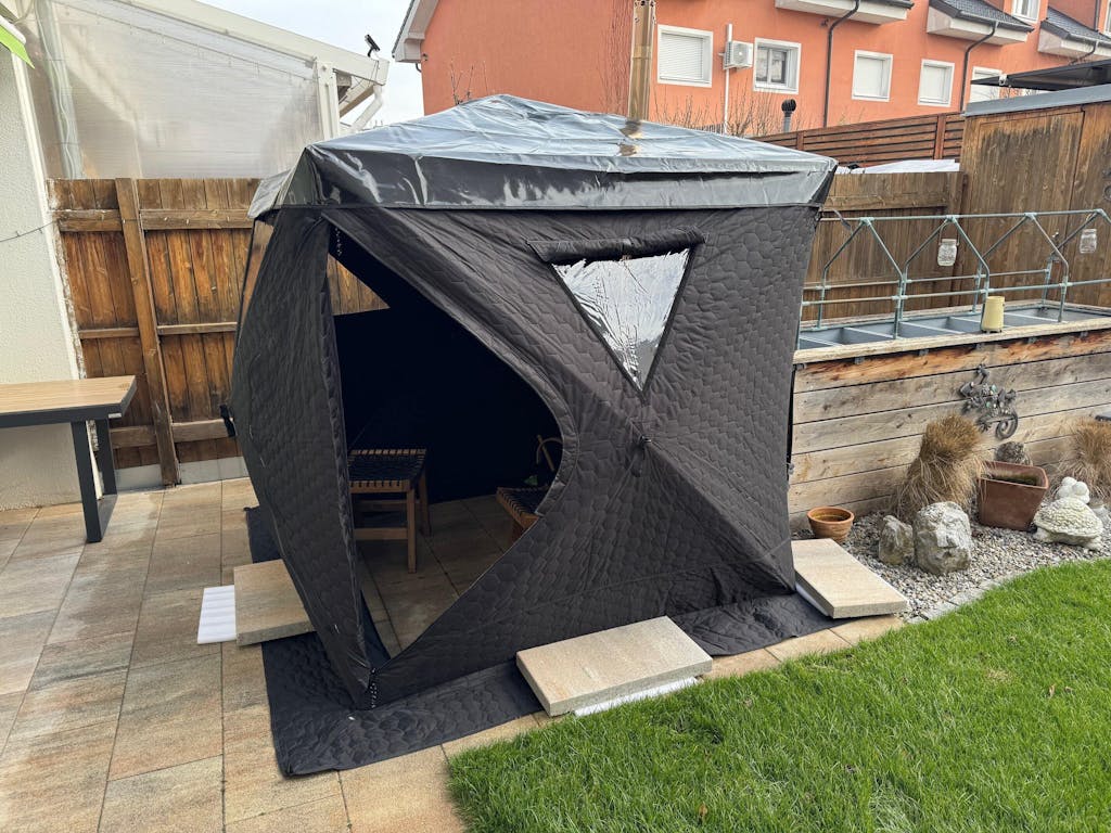 Zum Zelt bzw. der Sauna selbst - war anfänglich etwas skeptisch, ob der Ofen für das Zelt reichen wird, aber ich wurde eines Besseren belehrt. Der Aufbau ist schnell erledigt, das Einbrennen des Ofens ist noch am Tag der Lieferung passiert. Am selben Tag haben wir dann auch das Zelt eingeweiht. Seitdem haben wir die Sauna jetzt 3x seit Erhalt vor einer Woche benutzt und kommen jedes mal immer über 90 Grad (die Aufheizzeit beträgt ca. 15 Minuten, dann gehen wir bei ca. 60 Grad hinein und steigern langsam die Temperatur) - WAHNSINN für ein Zelt und Außentemperaturen um den Gefrierpunkt.
