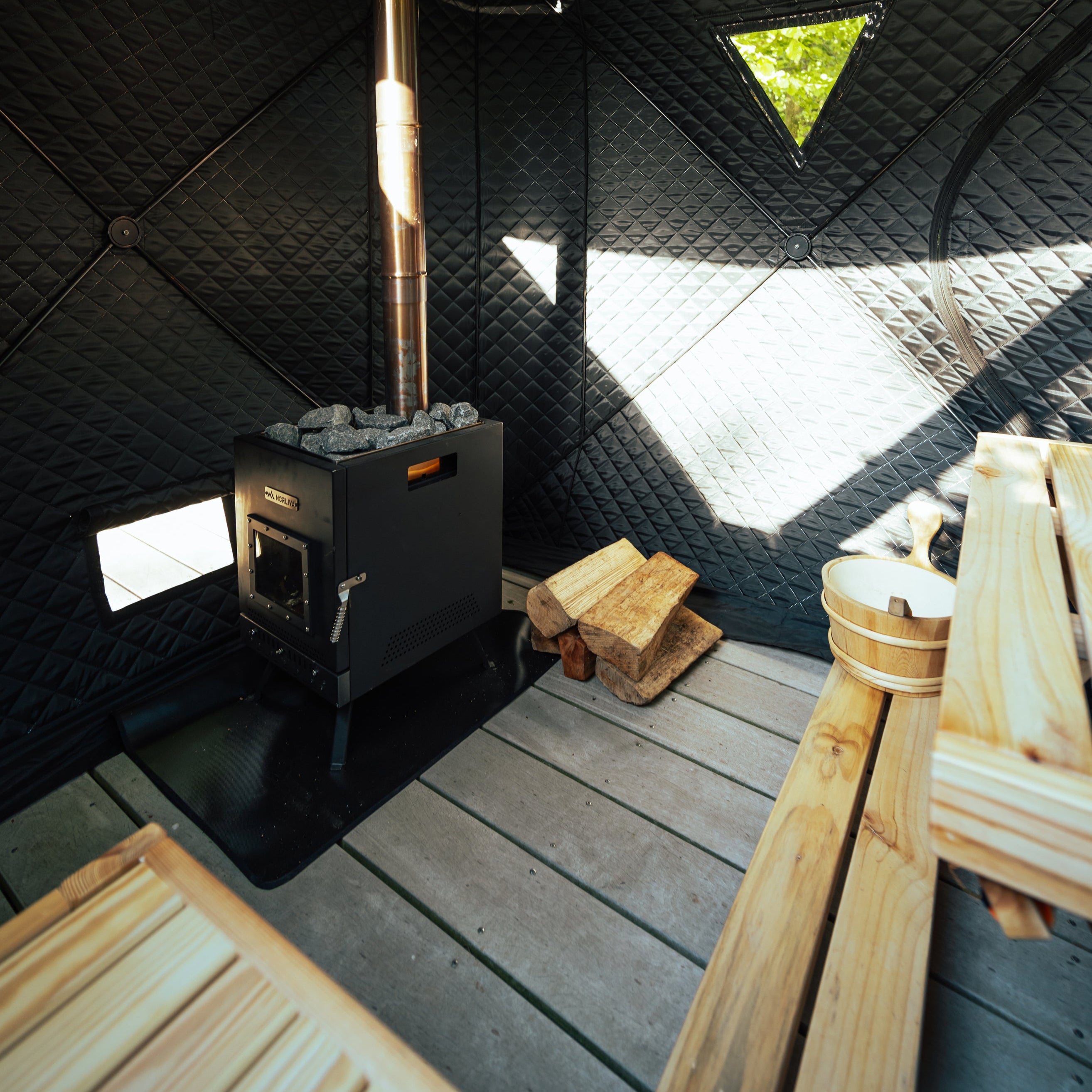 De kachel is afgestemd op de saunatent Isen voor optimale saunaomstandigheden.