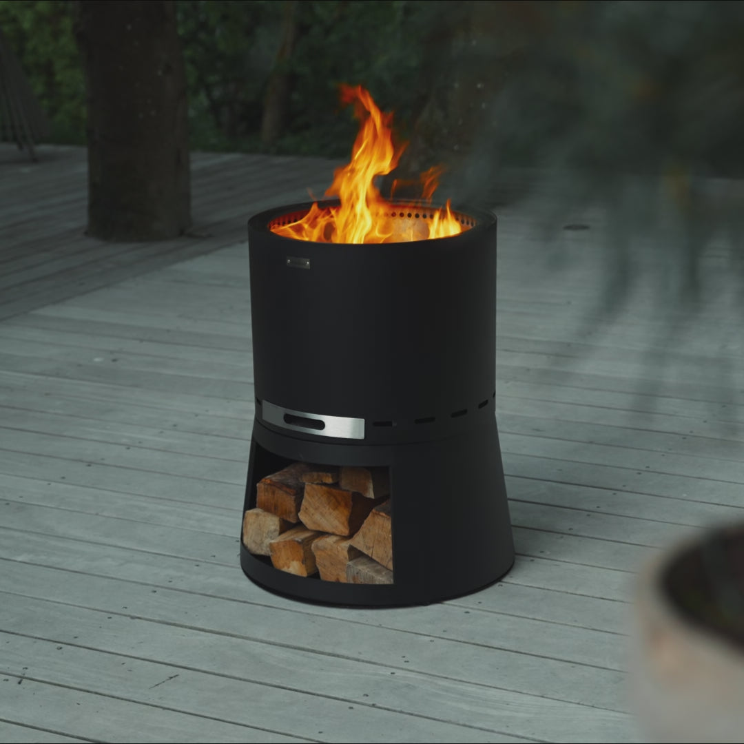 Het geïntegreerde vak biedt ruimte voor hout, tilt de vuurschaal naar een comfortabele zithoogte en beschermt de vloer tegen brandvlekken.